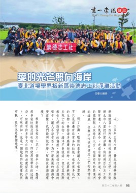 可觀,更何況是整個地球。 上,可想而知,光是一個地點的垃圾量就很 袋,但還有許多非大自然的物品遺留在沙灘 很多袋垃圾及回收物,即使用完帶來的垃圾 境? 變這樣?我們能夠做什麼,幫助改善海灘環 聲音,讓人不禁省思,為什麼美麗的海灘會 承受人們所留下的傷痕,海浪拍打在岸邊的 些死亡的生物。海洋不會說話,但它正默默 的生物,撿拾海洋廢棄物同時,也要避開這 不只是岸邊有非常多的垃圾,也有很多死亡 湃。 的海風,也無法吹熄崇德志工們的熱情澎 的植物配上灰暗的天空,迎面而來的是凜冽 聚岸邊,天氣寒冷,走在水筆仔步道,兩旁 新北市八里挖仔尾淨灘,將近兩百位志工齊 新區號召十四所大專院校崇德志工們,來到
