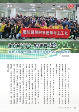 麗的句點。 響起〉〈感恩的心〉為這次活動,畫下最美 赳、氣昂昂的美好歲月,最後手語舞〈掌聲 時光倒流,長輩們彷彿回到了那曾經雄赳 演唱〈黃埔軍魂〉〈中華民國頌〉等歌曲, 子,各種節目精彩紛呈,更為長輩帶來軍歌 行舞〈日不落〉、相聲表演「學話」的段 才藝,踢踏舞表演獲得長輩們熱烈掌聲,流 演奏〈告白氣球〉,讓長輩們欣賞年輕人的 個太陽〉,為冷冷的天氣帶來暖意,電子琴 笑容溫暖長輩們的心! 橋榮家,國防醫學院崇德青年志工用青春與 們就這樣,來到了榮家的方向,初次造訪板 動、準備節目。「你朝我的方向走來」志工 輩們的需求。 們希望透過關懷表演與長輩們互動,瞭解長 懷長輩們,為了學習服務猶親的精神,志工 崇德青年志工社第一次來到板橋榮民之家關