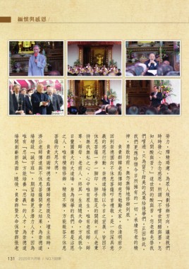場開創嶄新局面。隨後,負責群暨天命保管群張老 唯有「忠誠」方能培養「忠義」的人才,為崇德道 場增設「誠字班」,期望培養更多潛力人才。因為 濟公老師傳達與不休息菩薩開會之結果,為崇德道 菩薩的大恩大德。 之人,唯有積極修辦、精進不懈,方能報答不休息 日豐圓廣大的大道場。身為後學的我們,都是沾恩 尊、師母、老前人,終其一生追隨天命,方成就今 持無我無私之心,心中唯有眾生,唯有老祖師、師 休息菩薩一步一腳印、胼手胝足的開創。前人老秉 義的感恩行動。崇德道場得以今日之宏展,皆因不 回到崇德園向不休息菩薩叩首禮敬,是一份深具意 神,勇敢向前,無怨無悔地修辦到底。 我們更應珍惜今日所擁有的一切,承續您老的精 們嚐過,只為留下甜美的成果給後學們。正因如此, 知人間酸與苦?」這世間的酸與苦,您老都先替我 時時發心、念念感恩。所謂「不嚐世間醋與墨,怎 勞力,殫精竭慮,為眾人規劃修辦方