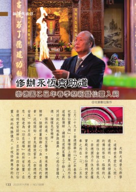 靈入祠的殊勝儀式,示現修辦慧命的永 崇德祠堂安設神位,並於每年四季舉行仙 悲,祂老為「功在道場」的所有仙靈,在 安座〉珍貴片段;回顧過往,感恩前人慈 責。流程開始,首先播放當年〈崇德祠堂 精神,接續前輩修辦之心血,是後代的重 德,緬懷先哲精神。 同回到此聖地參與盛典,齊心感念菩薩大 道場點傳師、講師及道親家屬上千餘人,共 祀暨仙靈入祠」;廣場搭上棚架,海內外各 三月二十九日,崇德園舉行「乙巳年春季祭