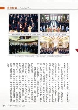 扎根。 習前人輩傳道精神,將道風道脈於世界各國 動下,所有海內海外幹部透過文化傳遞、學 續盡心努力,以及在總會領導、點傳師的帶 幕感人畫面,看見白陽弟子為一貫道傳承永 恩紀念大會〉精華版。大家聚精會神,一幕 會高峰會議〉及〈白水聖帝成道三十周年感 化讀經匯演〉、〈印尼一貫道總會暨各省分 會高峰論壇〉、〈海峽兩岸中華傳統經典文 的,定要把握當下,祝福大家道務宏展。 性,有德性天地讚嘆;人生是短暫、無常 詞,今天能入功德祿位,有功者來自於德 大同世界。接著由一貫道總顧問湯總裁致 為師尊師母分憂代勞,共同把道傳揚,成就 開來,感恩前人輩用心,更要記得分分秒秒 大道是何等幸福,這份幸福承先啟後、繼往 隨師尊師母、追隨所有前人輩,及得到寶貴 慧雙修,齊心 要讓修辦更有意義;命好就是,做好做對福