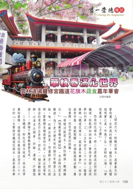 日的「二水贊修宮鐵道花旗木,蔬食嘉年華 廣結善緣,道務組及社教組推出四月二十六 演……,無論千難萬難都要完成。 辦,必須多次開會、討論、溝通、沙盤推 俱全的菜色引出食慾。因此,一個活動的舉 師,要發揮各種創意和巧思,以煮出色香味 船,唯一的辦法就是:想盡辦法!好比廚 難渡,為了更方便有效的接引有緣登上法 伏。」《地藏菩薩本願經》。末法時代眾生 結善緣,拉近和民眾的距離。 蔬食市集、遊戲闖關、祈福點燈等活動,廣 舉辦「鐵道花旗木,蔬食嘉年華會」,結合 夢幻列車,二 鐵道,妝點得如詩如畫。贊修宮也搭上這班 枝春滿,天心月圓」。 超現實之美,呼應了弘一法師的心境:「華 蕾絲邊,在和風的輕拂下,翩然出場!此種