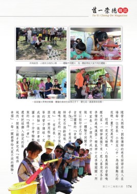 幸福」,每一關都帶給大家不同的體驗。 域內,搜集三顆才算完成「球得 還有把球擲入指定的區 契的「球得一孝」; 圖卡,十分考驗默 成後抽一張百孝經 等的管子傳球,完 朋友一齊用粗細不 球」;有家長、小 趣味十足的「親子保齡 特瓶充作保齡球瓶, 手作 吉祥圖案的「幸福 有以拓印方式印上 隊,一一體驗不同關卡, 有家長、小朋友分成四小 準備的美味漢堡,精氣神十足準備闖關。所 醒大家,一頓伸展操下來,眾人享用完各自 夜晚,畫下完美句點。 場每一位家長、小朋友心中,為這個難忘的 隨營火燃燒,劉點傳師的慈悲話語亦進入在