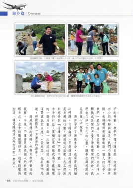 生活,讓愛護地球成為生活的一部分。 理方式,也會鼓勵親朋好友一起實踐環保 提醒。今後,不僅會更注意個人的垃圾處 道,卻能換來一方潔淨的海岸。 洋最真誠的回應。一袋垃圾,也許微不足 的一股力量。每一次撿起垃圾,都是對海 小小的付出,累積起來都能成為守護地球 刻感受到「守護海洋」不是口號,每一份 是身邊的行動。透過這次活動,志工們深 心呵護。守護海洋,不是遙遠的理想,而 花朵在心中綻放。 們也在淨化自己的心靈,讓善念與感恩的 轉換成改變的力量!淨化環境的同時,我 我們一起加油,互相勉勵,把今天的汗水 線,也將環保意識帶進每一個人的心中。 內心的平靜與滿足。我們不僅清理了海岸 手的勞動,我們不僅守護自然,也感受到