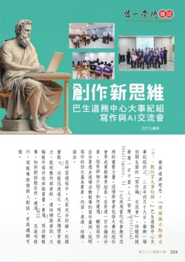 循。 巧,寫報導就像與人對談,有其邏輯可 導,如同對話般自然,運用 幅提升寫作效率與質量。善用 力,能統整內部資料、連結網路資訊,大 重點。 語法。 寫作的四大基本要素:內容、表達、結構、 並分享過去道場活動報導的寫作案例,說明 享,組長詳細介紹了如何運用 會界成員與學界組長。在長達一百分鐘的分 視的重要力量。這場與會者包括大事紀組社 發展一日千里,人工智慧( 別開生面的「寫作與 事紀組於二 (註)