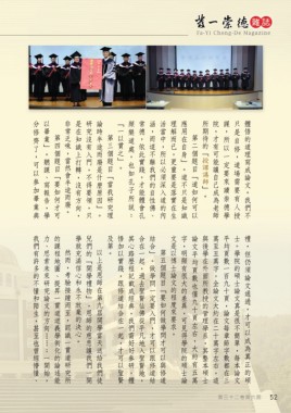我們有許多的不懂和陌生,甚至也曾經懵懂、 力、思索未來研究論文的方向……;一開始, 的課程地圖、提昇一貫道道義學術化的論述能 學就充滿信心和永不放棄的決心。 兒們的「開學禮物」,恩師的慈悲讓我們一開 及第。 悟加以實踐,跟修道結合在一起,才可以聖賢 其心路歷程記載成經典,我們需好好參研,體 合在一起,過去聖賢仙佛從平凡地入聖賢地, 結合」。做學問一定要入門,才可以跟修道結 文是以博士論文的程度來要求。 字,明顯有很大的差異,可見得學院的碩士論 論文平均頁數也僅九十頁左右,大約有五萬 與後學在外面所教授的管理學系,其整本碩士 萬至五萬字,全論文大約在二十萬字左右,這 平均頁數一百九十頁,論文每章節字數都在三 士。學院的碩士論文真是很不簡單,每本論文 禮,但仍須論文通過,才可以成為真正的碩