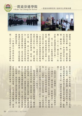 間,但卻是一段非常有意義的 殊勝的福氣。 無邊的天恩師德,是多麼寬闊 到崇德學院學習,是多麼浩瀚 知。這都讓後學深刻感受能來 於理、氣、象三界的意義認 開拓後學對於學道、修道,對 祖師王祖的三極一貫,更無限 的體認與深入,尤其是十五代 一再再洗滌加強後學對修辦道 及各單位前人輩的德行典範, 經典、對道統與歷代祖師,以 闢入理解析與引導中,對聖訓 於踏上更穩健的學習之路。 難,一次一次,建立信心,終 導,讓我們一點一滴排除困 的經驗傳承,和滿滿的愛心引 姐們的照顧、幫助,還有寶貴 猶豫過,然而,因為有學長學