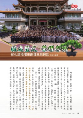 否精進?同時也說明,二六時中,改脾氣去 發亮。老師也問大家,進入修辦的領域,有 理天有名字,要「行功立德」來讓自己名字 壇、家壇,既然是成為壇主之天職,必是在 轉,活佛恩師接筆臨壇慈勉,無論你在公 用之大道顯,微禮細節日常中。 論修行之實義,深入修心毛病空。……體之 存誠,呂法律主慈悲臨壇,勉勵大家,「 或顯達,都要不怕困難,堅守自己的志節。 好自己的修辦慧命〉,期勉大家,不管窮困 展開序幕。首先,由謝老點傳師慈悲〈守護 是一座重要橋樑。在善歌隊帶動善歌聲中, 一個「主人」的天職,也就是「正己成人」, 在道場中幫助 接受仙佛法雨滋潤。壇主是繼承聖賢仙佛, 開。共有二千二百位左右壇主,齊聚一堂, 副壇主班,在三月八、九日於普化佛院展 恢復活動及生機,彰化道場一年一度的壇主