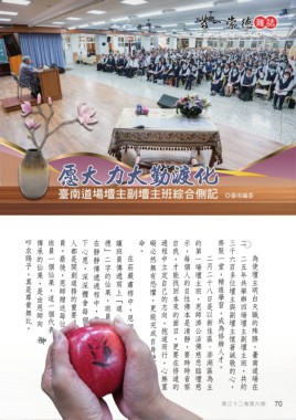 在莊嚴肅穆中,恩師                   二月二十八日是以新佳區、澎湖區為主  ○ 二五年共舉辦四場壇主副壇主班,共約  為使壇主明白天職的殊勝,臺南道場在