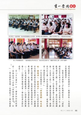 好,班務組用心安排「班務經營技巧 感受。 發心,以期提升傳題品質,帶給班員全新的 心,以真道真理醍醐灌頂,以博學多聞鼓舞 專注學習。希望傳題講師以循循善誘啟發信 師事先撰寫教案,參與前賢個個精神奕奕, 於光慧文教館各場地進行教學演示,授課講 程,傳題深入,實務進步。 承,開創新的局面。」 很大的力量,共同為學界的發展、道場的傳 路,大家用心投入,讓班務蓬勃發展,發揮 師用心設計教案,引導莘莘學子走向修行的 歡來佛堂上課,非常不簡單。看到各道場講 網路世界非常多元,要如何成全高中生,喜 互相觀摩學習。 過現場課程的教學演示,教學相長,各道場