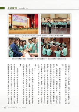佩環講師帶著學員進行團體活動,一開始從 快速度,完成主持人說明的任務。後續由林 的支援前線,各隊伍都使出渾身解數,以最 盡。 到高中部整體的熱情,和樂融融,意猶未 生們發揮天賦、展現長才,並深深感受體會 演,如跳舞、唱歌、演奏、戲劇等等,讓學 藝。」 條線;「志於道,據於德,依於仁,游於 再以賓果連連看,看哪一個組別可以連成三 於高中部以及各項運動的常識瞭解有多少? 學堂,腦力激盪結合機智問答,考考大家對 還能培養學生之間的默契;接著是高中部小 的方式進行,不僅能讓大家活動活動身體, 戰、飛盤躲避球、闖關大富翁,以團隊合作 滿。」 情揮灑才能,祝福活動圓滿成功、收穫滿 以探索自己,多方嘗試,學習品格教育,盡